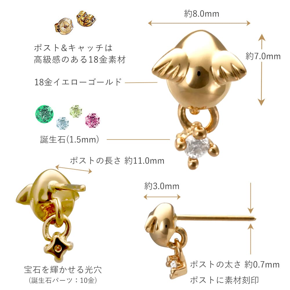 10金誕生石パーツ (ダイヤモンドのみ18金。旧仕様の為、在庫無くなり次第10金(新仕様)に変更)縦×横×厚み(mm/片方) : 約7×約8×約3