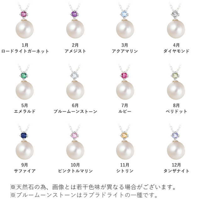 シルバー 誕生石(2mm) 天然パール(6mm or 7mm) ※天然パールを使用しているため、色味や大きさに若干の違いが出てきてしまいます、 予めご了承ください。 ※誕生石は天然石を使用しているため、性質上、色味などに個体差がある場合がございます。