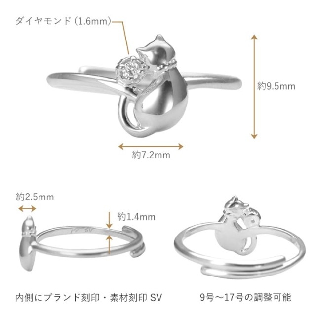 しっぽの先にダイヤモンドが輝く ネコのフリーサイズリング。