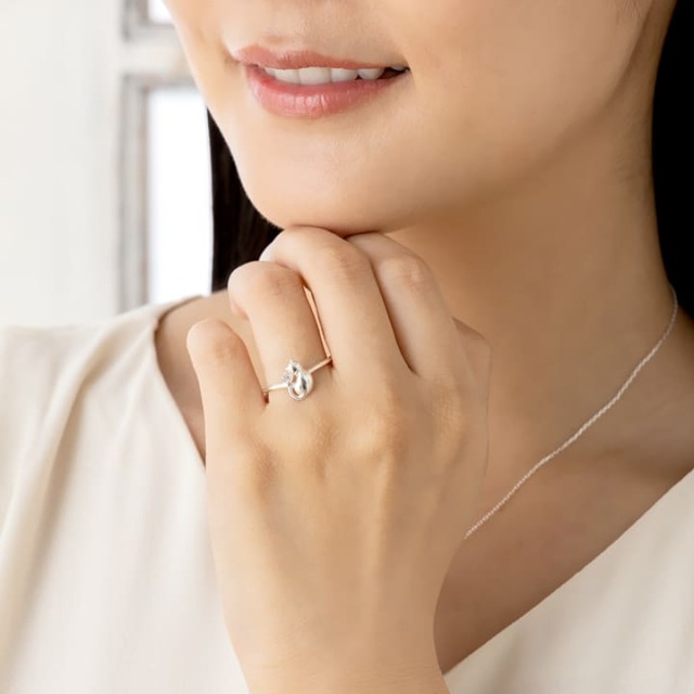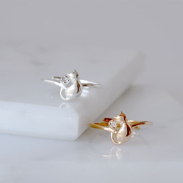 指にそっと寄り添うネコが、なんとも可愛いリング。 シンプルで綺麗なシルエットのネコと、輝くダイヤモンドが美しく、上品さと可憐な印象を合わせもちます。 調整可能なフリーサイズリングは、お相手のサイズがわからない場合のギフトにもぴったりです。