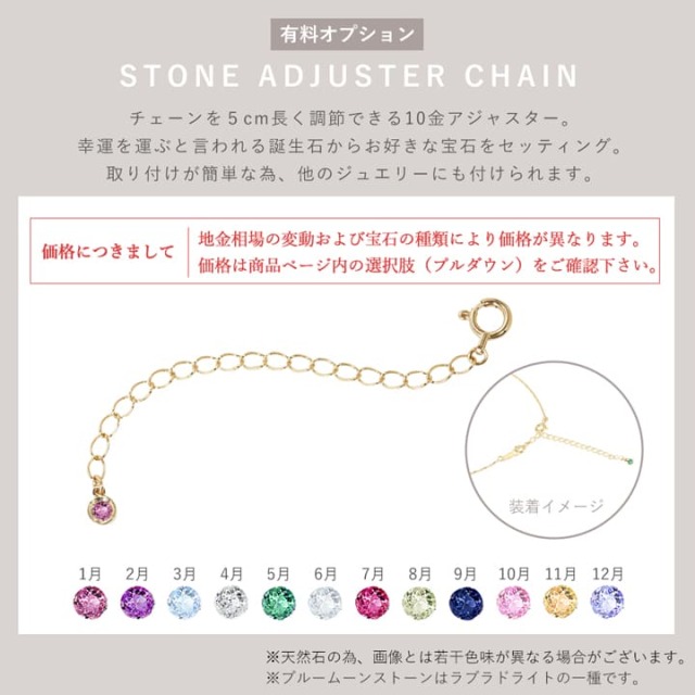 螺旋状にねじるような細かいカットがキラキラと煌めくラインパーツ。 左右には小さなミラーボールがキラリと輝きます。 華奢で洗練された印象のネックレスです。 有料オプションで、誕生石付きの5cmアジャスターチェーンをご用意。(税抜5,000円~) 簡単に取り付けができるので、服装に合わせてチェーンを長めに身につけたい方におすすめです。 後ろでさりげなく輝く誕生石がワンランク上のおしゃれを演出します。