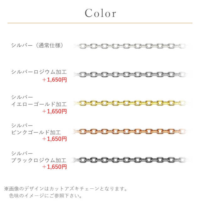 【選べる素材】 シルバー シルバー(ロジウム加工) シルバー(ピンクゴールド加工) シルバー(ブラックロジウム加工) シルバー(イエローゴールド加工) |