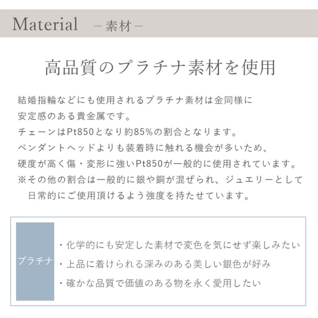 アレルギーの原因になりやすいニッケルや亜鉛は使用していません。大切な贈り物や記念にお選び頂くジュエリーだからこそ、丁寧で妥協の無いものづくりを続けています。