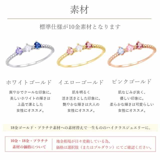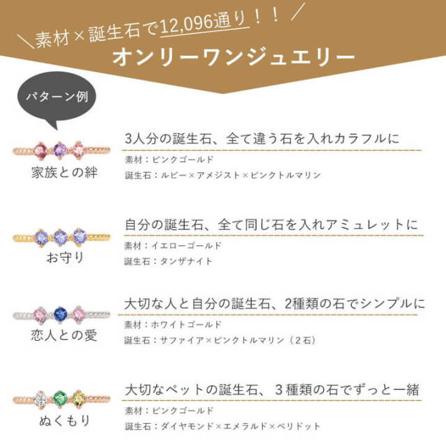 素材7種類(10金・18金・プラチナ)と誕生石12石から好きな組み合わせを選べるのでパターンは数万通り以上。