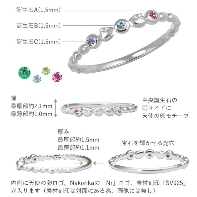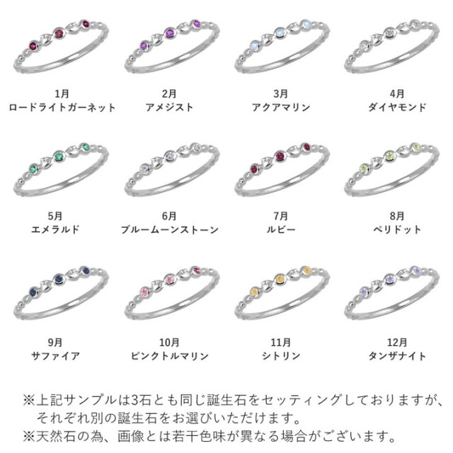 中央にお子様と両サイドにご両親、第一子と第二子と第三子など家族構成に合わせたり、お好きなカラーや宝石の意味から選ぶのも◎