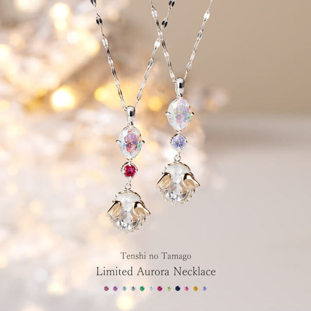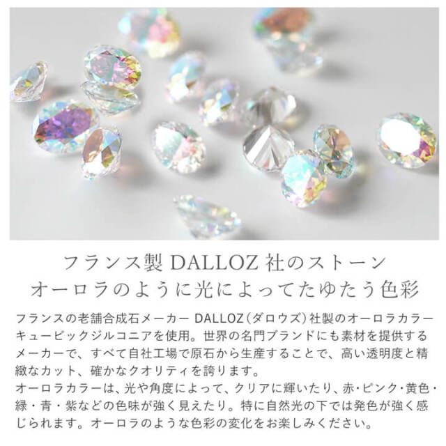 トップには、光を受けるたびに繊細な色が揺らめくオーロラカラーのストーン。