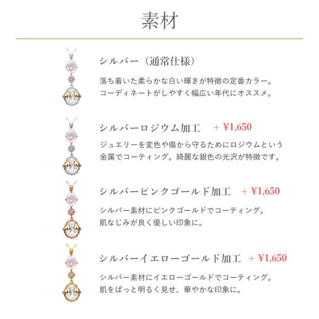 アレルギーの原因になりやすいニッケルは使用していません。大切な贈り物や記念にお選び頂くジュエリーだからこそ、丁寧で妥協の無いものづくりを続けています。